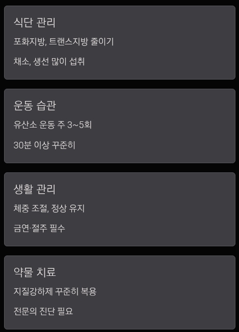 - 식단 관리: 포화지방, 트랜스지방이 많은 음식(패스트푸드, 튀김류, 가공육)을 줄이고, 채소와 생선을 많이 섭취하세요.