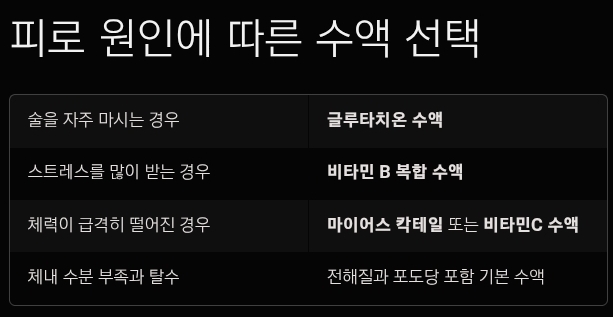 피로의 원인은 사람마다 다릅니다. 따라서 수액 역시 목적에 따라 맞춤형으로 선택해야 효과를 극대화할 수 있습니다.