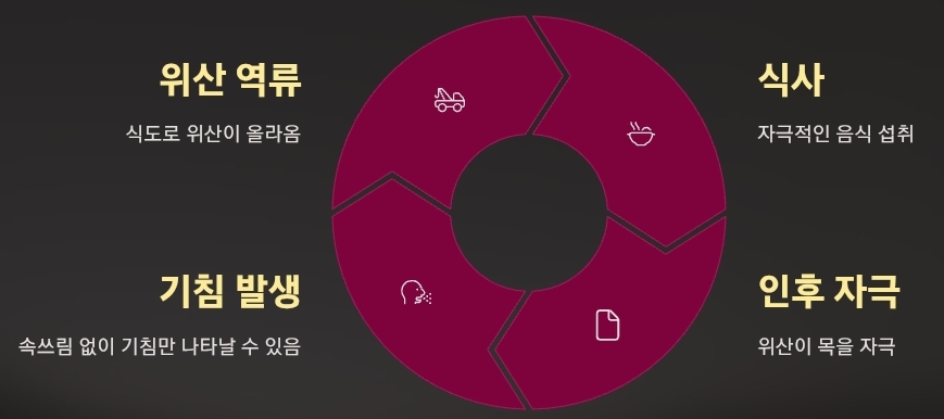 속쓰림 없이 기침만 나타나는 경우도 있습니다. 식사 후 바로 눕거나 밤에 기침이 심해진다면 의심해볼 수 있습니다. 이 경우 식습관 개선과 함께 필요 시 위산 억제제 복용이 필요합니다.
